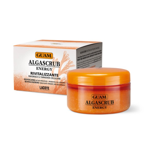 Algascrub Energy kjennetegnes av tilstedeværelsen av guamalger, havsalt, vitamin E og F, essensielle oljer fra appelsin, mandarin og sedertre, og en verdifull blanding av økologiske oljer, inkludert hamp-, oliven- og solsikkeolje, rike på essensielle fettsyrer som omega 6 og omega 3. Vitamin F gir næring til huden, gjør den myk og smidig og stimulerer rask cellefornyelse, mens vitamin E, sammen med oljene beskrevet ovenfor, har antioksidant-, beroligende og mykgjørende egenskaper. De essensielle oljene i de spesielle guam-algascrub-duftene gjenskaper en omsluttende aromaterapiatmosfære på badet ditt, med positive effekter på mental og fysisk velvære.