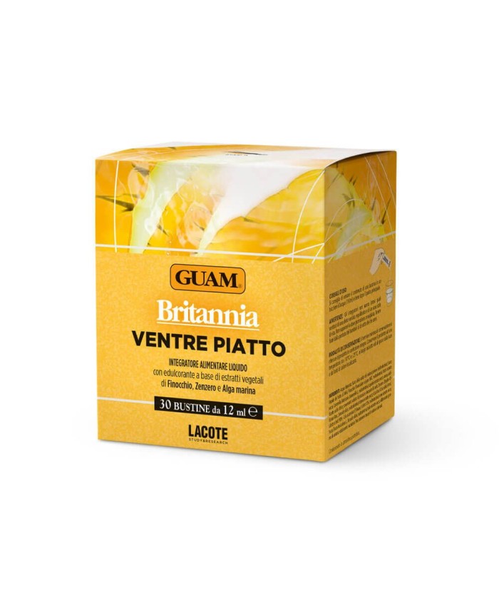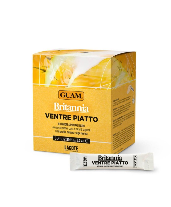 Britannia Ventre Piatto er et flytende kosttilskudd basert på fennikel, kamille og ingefær som er nyttig for fordøyelses funksjonen og for å fremme eliminering av luft i magen. Cola og Alga Fucus stimulerer stoffskiftet.