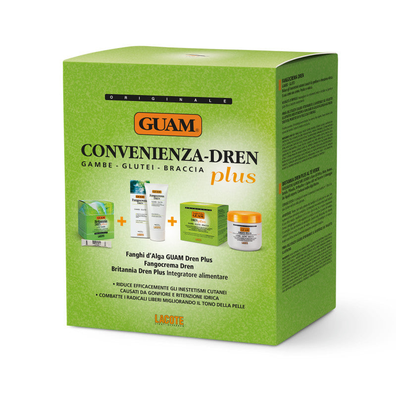 En pakke designet for å oppnå det beste fra Guam dreneringsbehandlinger, den perfekte synergien mellom høyeffektiv kosmetikk og kosttilskudd for å naturlig drene overflødig væske.