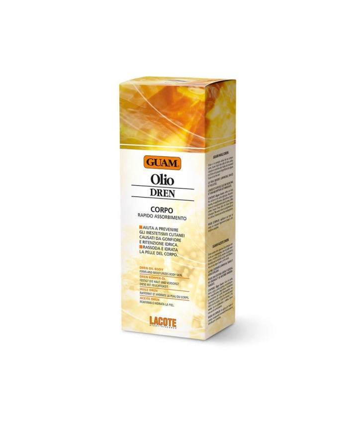 BESKRIVELSE Dren Body Massage Oil bekjemper og bidrar til å forebygge hud urenheter forårsaket av hevelse og væskeansamling. Takket være den aktive synergien mellom komponentene, kombinerer den dennærende virkningen av solsikke- og olivenolje med de markante drenerende egenskapene til GUAM-alger i forbindelse med grønn te. Den krydrede og omsluttende duften skaper en berusende opplevelse av velvære og komfort, takket være harmonien mellom bergamott og nellik. Lett og silkemyk, den er ikke fet og absorberes raskt.