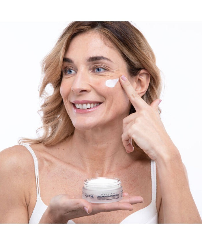Intensiv krembehandling som regenererer og forsterker ansiktshuden med en umiddelbar og langvarig løftende effekt. Guam Antioxidant Anti-Wrinkle Face Cream er beriket med et marineekstrakt som, kombinert med dermoaktive nanosfærer med antialdringseffekt, gjør huden glattere og mer elastisk, med mindre synlige rynker. Den umiddelbare løfteeffekten oppnås takket være virkningen av Botox-lignende kompleks, mens antialdringseffekten genereres av de spesifikke dermoaktive nanosfærene med målrettet selektiv virkning.